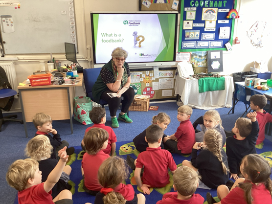 As part of Green Class mission Week, Nina from Walton and Hersham Food Bank came to visit us. She told us all about how we can help and where the food goes.