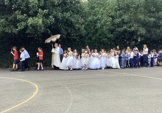 On Monday 23rd June, we held a Blessed Sacrament procession lead by Fr Richard, Altar servers from Year 6 and our First Holy Communion children. It was a very prayerful and special occasion, giving us the opportunity to show our love and devotion to Jesus, present in the consecrated host, the Blessed Sacrament. The younger children formed the path for the procession by singing and signing with great reverence the hymn, Here I am to Worship. Year 3 joined Fr Richard in the chapel for some time of Adoration before reposing the Blessed Sacrament in the tabernacle.