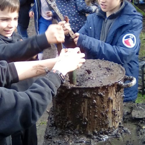 After that, the children began to explore the area by digging to find stones, which they cracked open to see what colours and patterns were inside. They made a mud soup which was a bubbly explosion and even created some mud pies to serve with it.