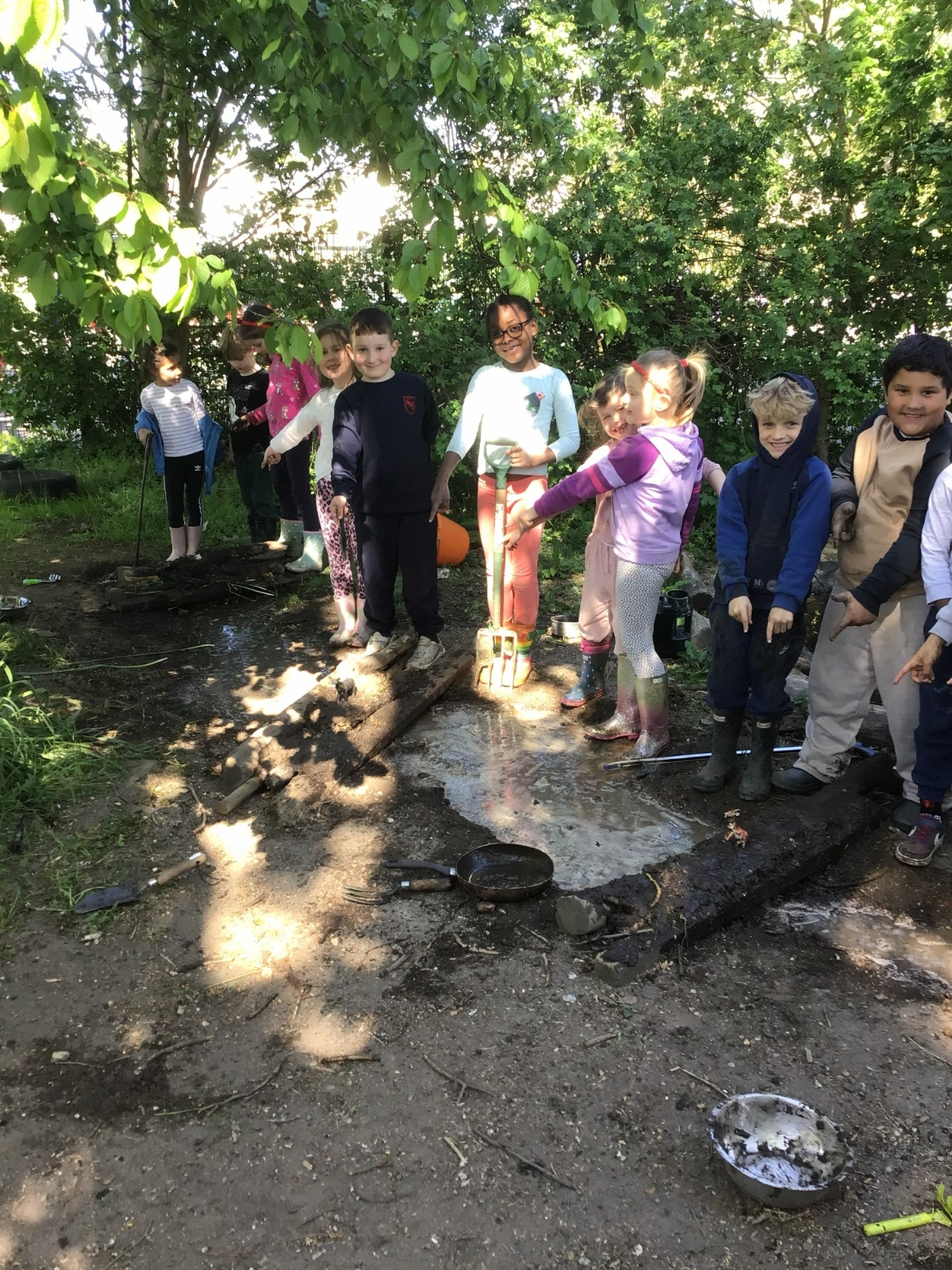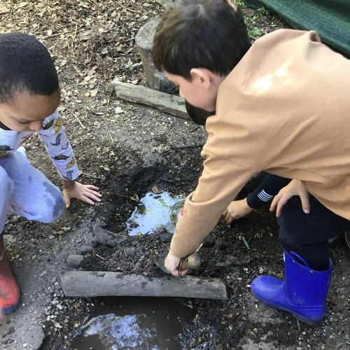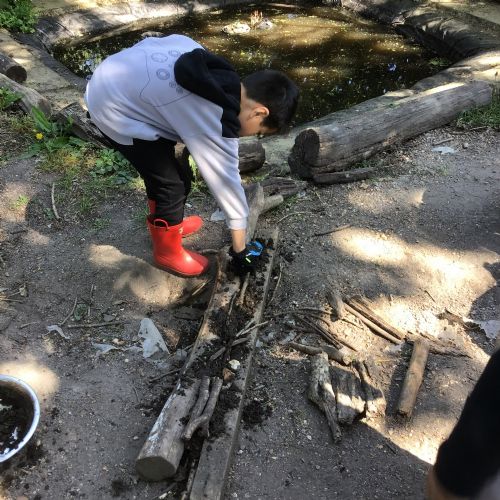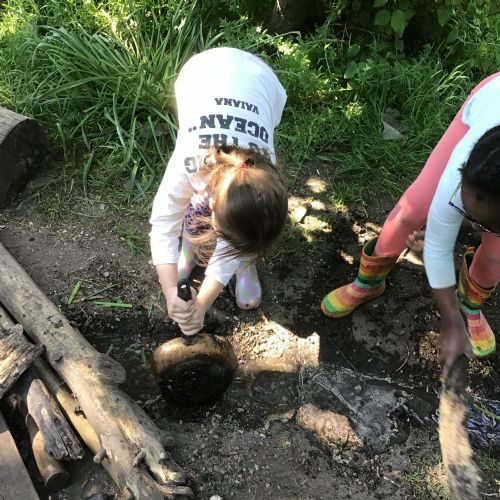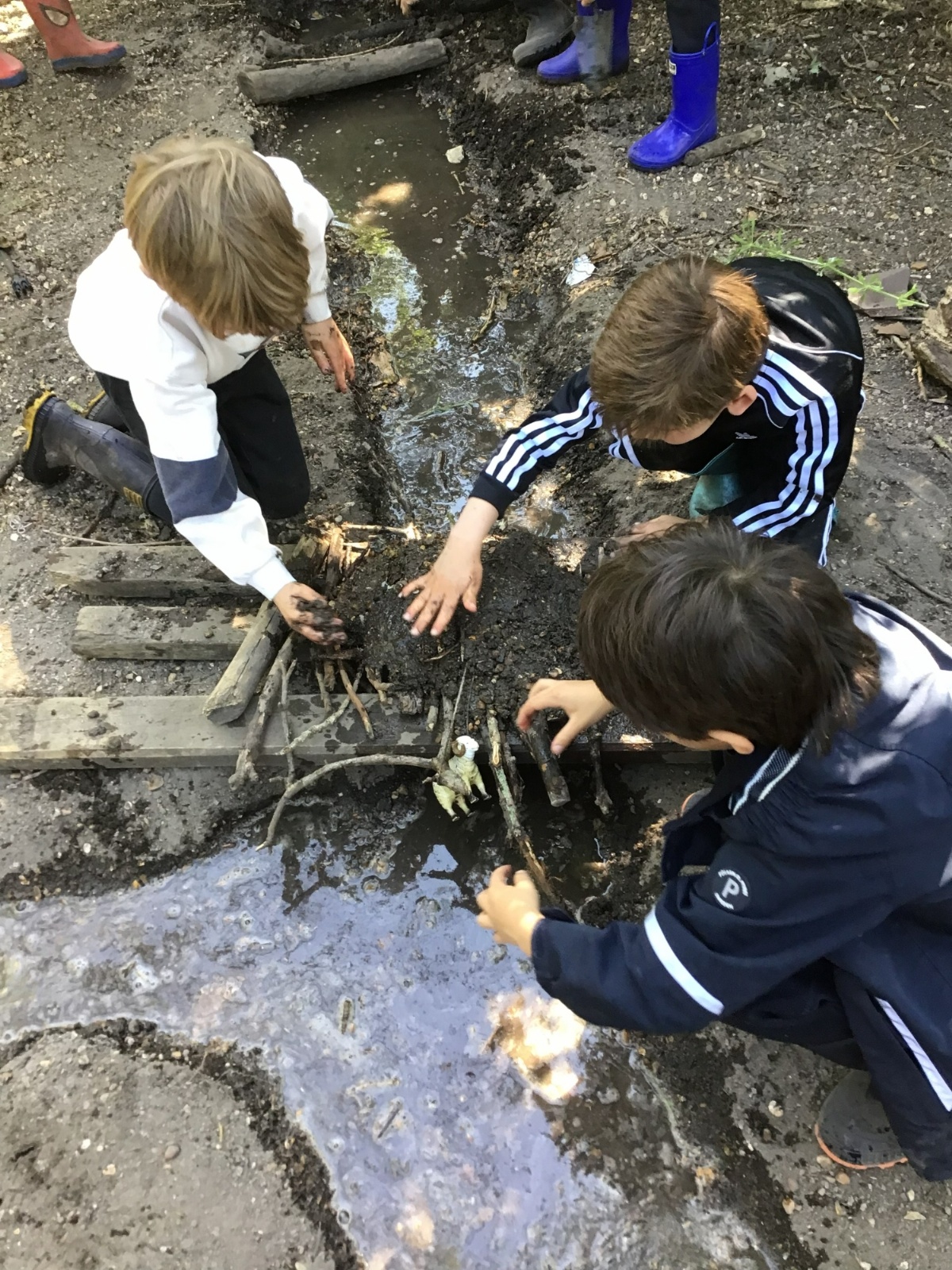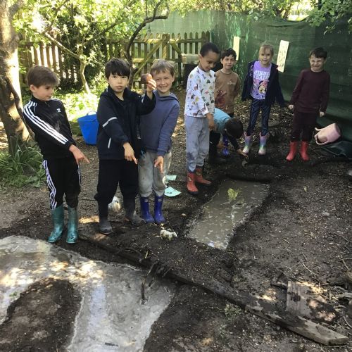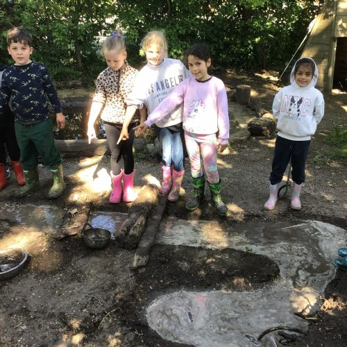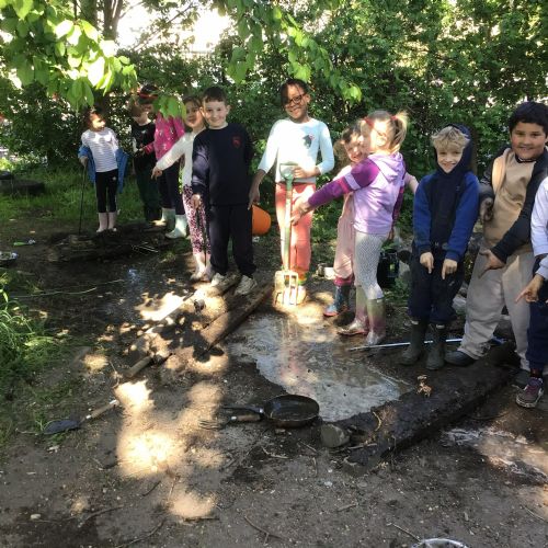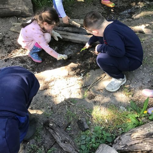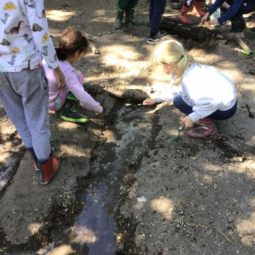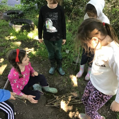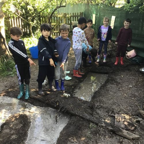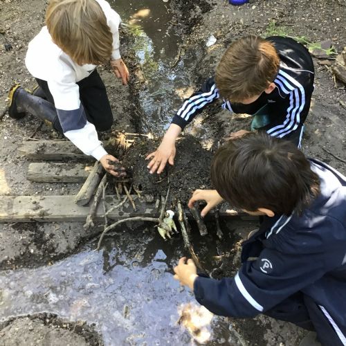 Violet class had a wonderful team building experience today while out in Forest School. They worked in smaller groups to build a bridge for their ram/goat to cross the bridge without falling into the 'river'. Working as a class, they dug out trenches and filled them with lots of water. They soon realised that by having the right ratio of mud to water, they could make a mixture to stick all the sticks together. Fun was had by all!