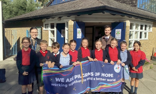 On Thursday 25 September, a group of children from Year 5 had the privilege of attending the Mission Together Jubilee Mass at St Theodore’s Catholic Church, Hampton. The Mass, celebrated by Bishop Jim Curry, brought together schools from across the Dioceses of Arundel and Brighton, Southwark, and Westminster in a joyful celebration of the Jubilee Year of Hope.