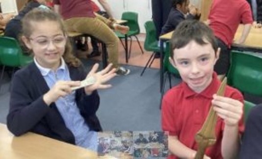 On Thursday 23rd October, Year 3 had a visit from Chertsey Museum's prehistory expert. They learnt about life in the Stone Age and how it changed with the discovery of metal (bronze and iron). There were lots of fascinating artefacts to look at and handle and it was fun sketching animals and bones and guessing the mystery objects. The children were able to get dressed in Stone Age outfits and even turned their hands to weaving and spinning.